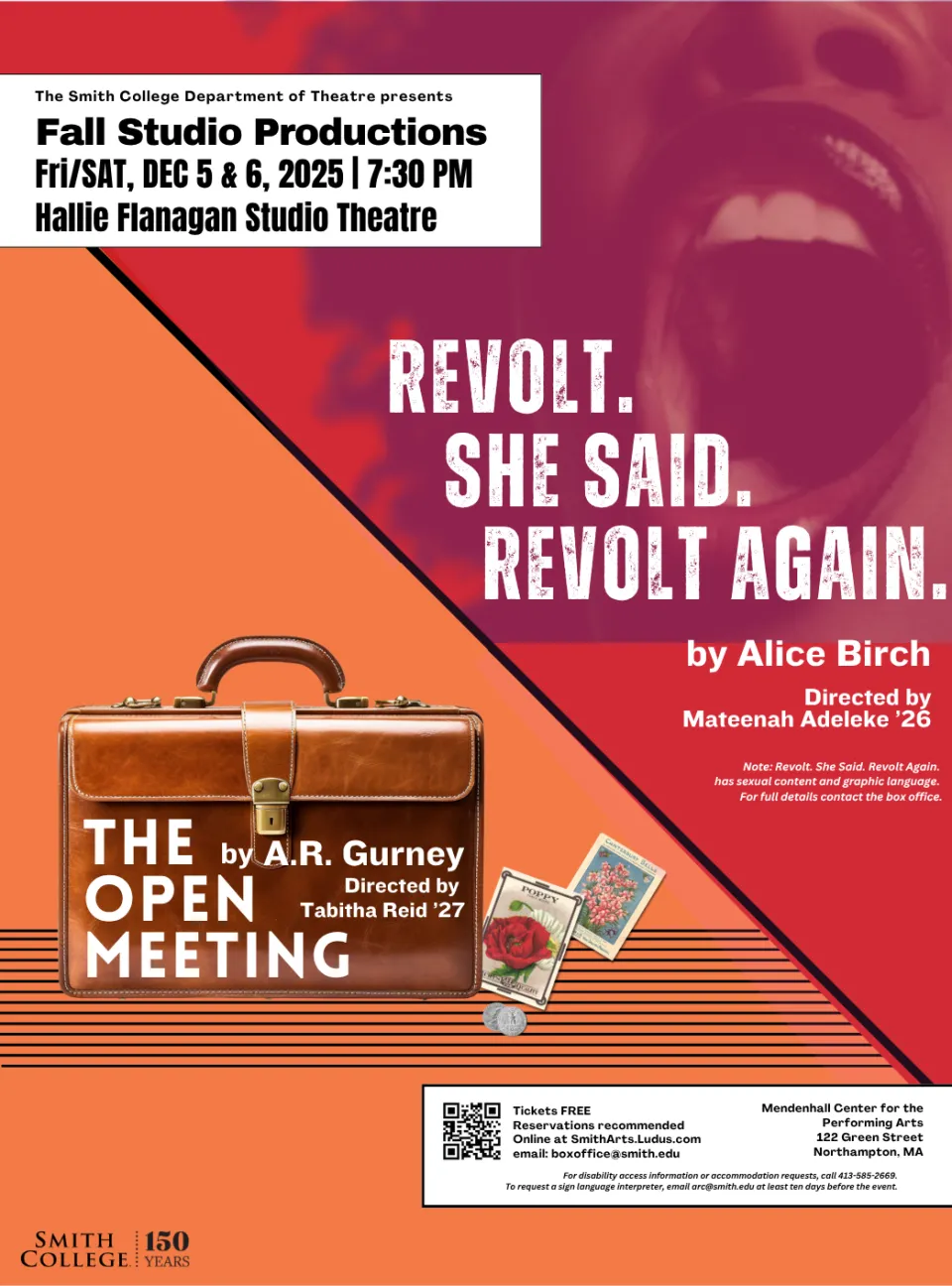 Audiences should note that Revolt. She Said. Revolt Again. has sexual content and mature language. Full details are available by contacting boxoffice@smith.edu. Tickets are free, reservations are encouraged at smitharts.ludus.com.