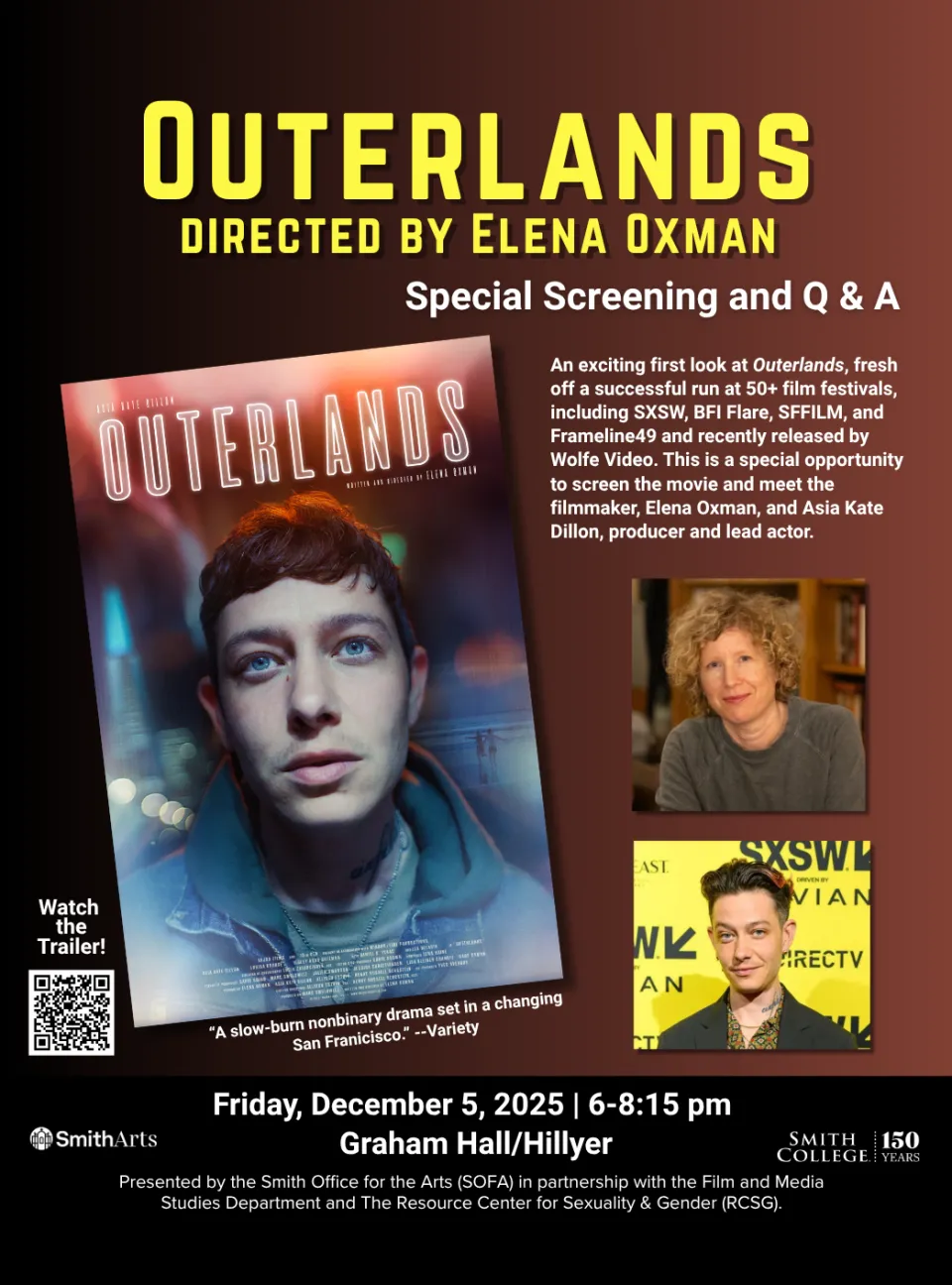 Northampton, MA – The Smith College Office for the Arts (SOFA) is excited to bring Outerlands, the critically acclaimed, multi-award-winning debut feature written and directed by Elena Oxman to Smith for a special campus screening and Q&A with the filmmaker and lead actor and producer, Asia Kate Dillon (Billions) on December 5 at 6 p.m. in the Graham Auditorium in Hillyer Hall. Outerlands is distributed by Wolfe Video, the longest-running and largest distributor of LGBTQ+ films in the world, and has its digital release on November 26. The film also features Louisa Krause (The Girlfriend Experience), Ridley Asha Bateman (Lou), Lea DeLaria (Orange Is the New Black), and Daniel K. Isaac (Elsbeth). The screening and talk are open to the public.