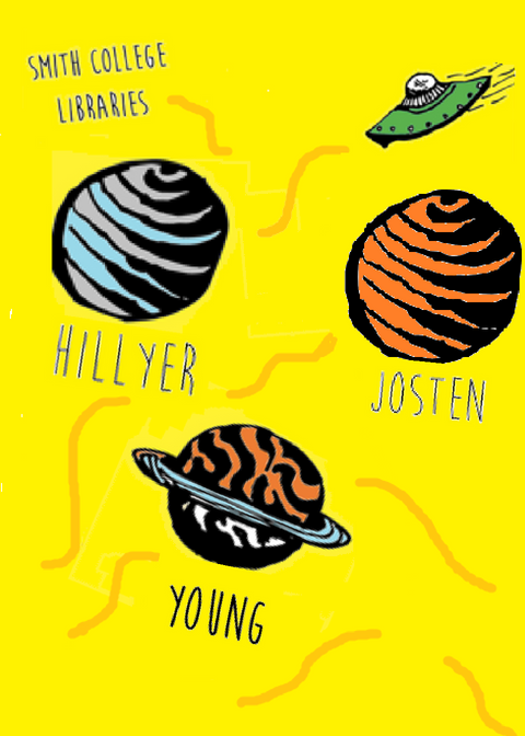 Yellow background with three striped planets labeled Hillyer, Josten, and Young, a flying saucer, and Smith College Libraries text. Playful and whimsical.